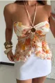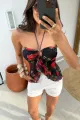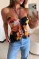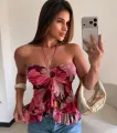 Blusa floral de caimento suave com alça halter e nó central em anel, criando um decote elegante e moderno. Tecido leve e macio, estampa floral vibrante que valoriza qualquer look. O franzido na barra adiciona movimento, sem perder o conforto. Combine com jeans, shorts ou saias para o verão, passeios, festas ao ar livre ou eventos descontraídos.